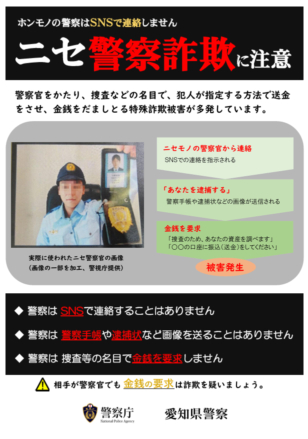 犯罪・防犯対策 ~2026.3~ 2026年3月3日 最終更新日時 : 2026年3月3日 株式会社力組 偽警察から連絡が来ても慌てずに対応しましょう! 金銭の要求や送金を促されたら詐欺を疑ってください! 間違っても口座番号を教えたり振込等しないようにしましょう。